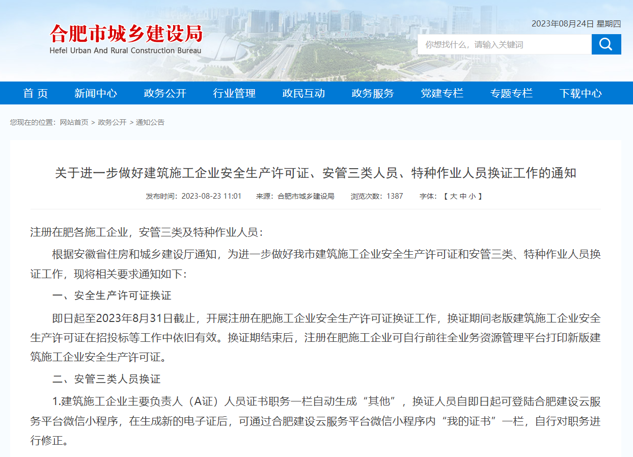 即日起至2023年8月31日截止,開展注冊在肥施工企業(yè)安全生產(chǎn)許可證換證工作,換證期間老版建筑施工企業(yè)安全生產(chǎn)許可證在招投標等工作中依舊有效。換證期結(jié)束后,注冊在肥施工企業(yè)可自行前往全業(yè)務資源管理平臺打印新版建筑施工企業(yè)安全生產(chǎn)許可證。