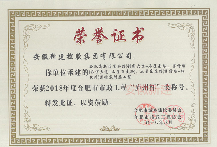 安徽新建控股集團(tuán)承建項(xiàng)目榮獲2018年度合肥市市政工程“廬州杯”獎(jiǎng)