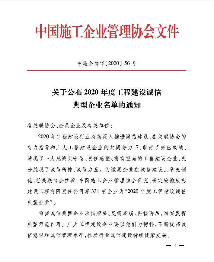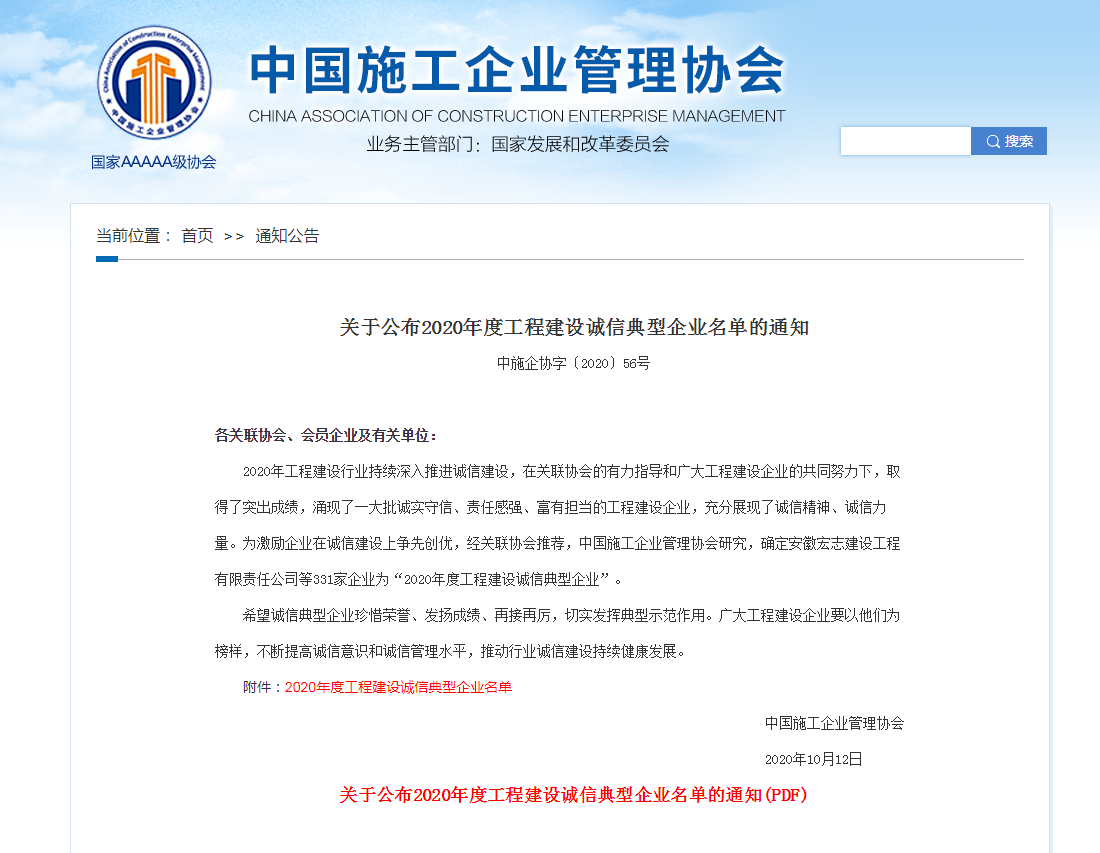 該榮譽(yù)是中國(guó)施工企業(yè)管理協(xié)會(huì)為深入誠(chéng)信建設(shè),在工程建設(shè)企業(yè)領(lǐng)域內(nèi)樹(shù)立一大批誠(chéng)實(shí)守信、責(zé)任感強(qiáng)、富有擔(dān)當(dāng)?shù)墓こ探ㄔO(shè)企業(yè),充分展現(xiàn)誠(chéng)信精神,誠(chéng)信力量,進(jìn)一步激勵(lì)企業(yè)在誠(chéng)信建設(shè)上爭(zhēng)先創(chuàng)優(yōu)。據(jù)悉,本次在全國(guó)范圍內(nèi)共評(píng)定331家企業(yè)為“2020年度工程建設(shè)誠(chéng)信典型企業(yè)”。