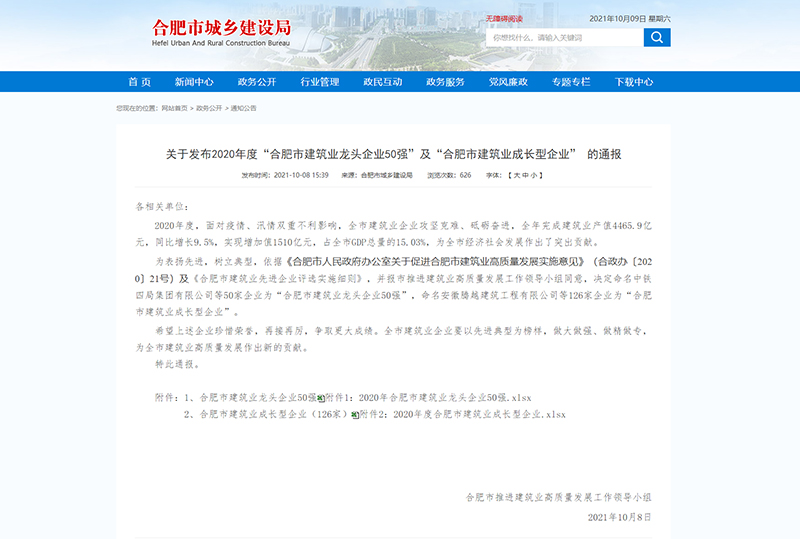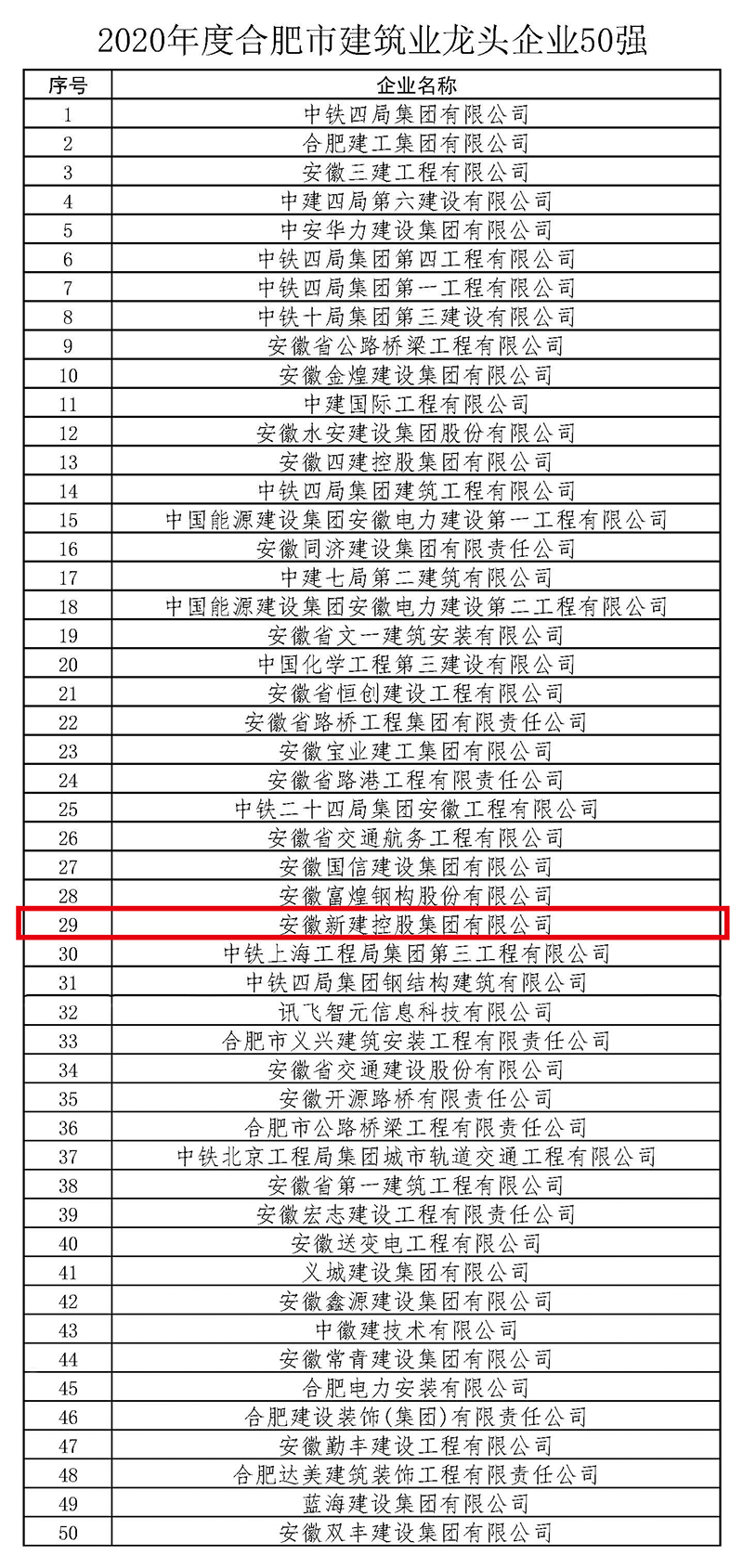 10月8日,合肥市城鄉(xiāng)建設(shè)局網(wǎng)站發(fā)布2020年度“合肥市建筑業(yè)龍頭企業(yè)50強”的通報,安徽新建控股集團榮獲2020合肥建筑業(yè)龍頭企業(yè)第29名。