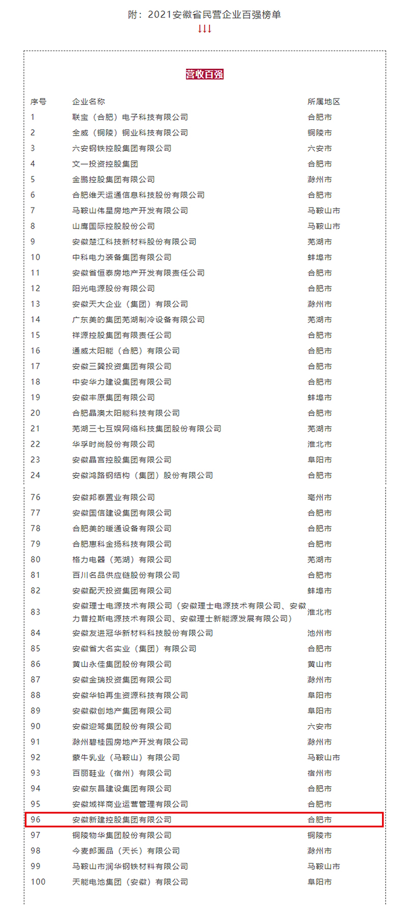 10月21日上午,由安徽省發(fā)展民營(yíng)經(jīng)濟(jì)領(lǐng)導(dǎo)小組主辦,安徽省工商業(yè)聯(lián)合會(huì)、省經(jīng)濟(jì)和信息化廳、省市場(chǎng)監(jiān)督管理局承辦的2021安徽省民營(yíng)企業(yè)百強(qiáng)發(fā)布會(huì),在阜陽市隆重舉行。安徽新建控股集團(tuán)位列“2021安徽省民營(yíng)企業(yè)100強(qiáng)”營(yíng)收榜單第96位,這也是安徽新建控股集團(tuán)自2019年以來連續(xù)第三次進(jìn)入安徽省民營(yíng)企業(yè)百強(qiáng)榜單,充分體現(xiàn)安徽新建控股集團(tuán)不斷進(jìn)階的綜合實(shí)力。
