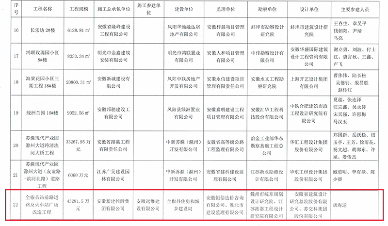 12月22日,安徽省滁州市住房和城鄉(xiāng)建設(shè)局、交通運(yùn)輸局、水利局聯(lián)合印發(fā)《關(guān)于公布2021年度第一批滁州市建設(shè)工程“瑯琊杯”獲獎(jiǎng)名單的通知》,安徽新建控股集團(tuán)承建的全椒縣站前路道路及火車(chē)站廣場(chǎng)改造工程榜上有名。