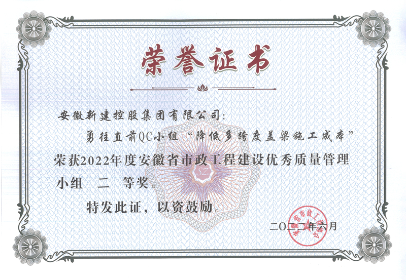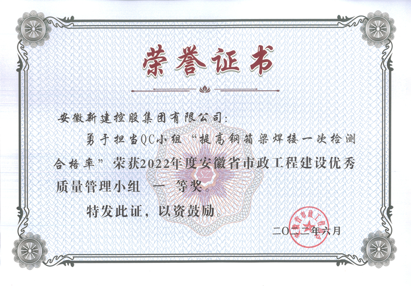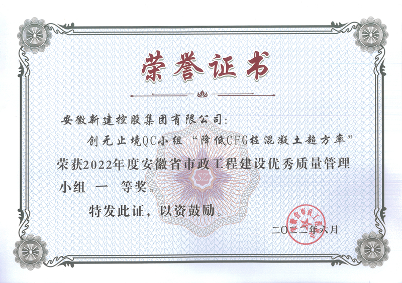 近日,安徽省市政工程協(xié)會頒發(fā)了2022年度安徽省市政工程建設優(yōu)秀質(zhì)量管理小組成果榮譽證書,安徽新建選送的3項創(chuàng)新科技成果全部獲獎,榮獲優(yōu)秀質(zhì)量管理小組一等獎2項,二等獎1項。