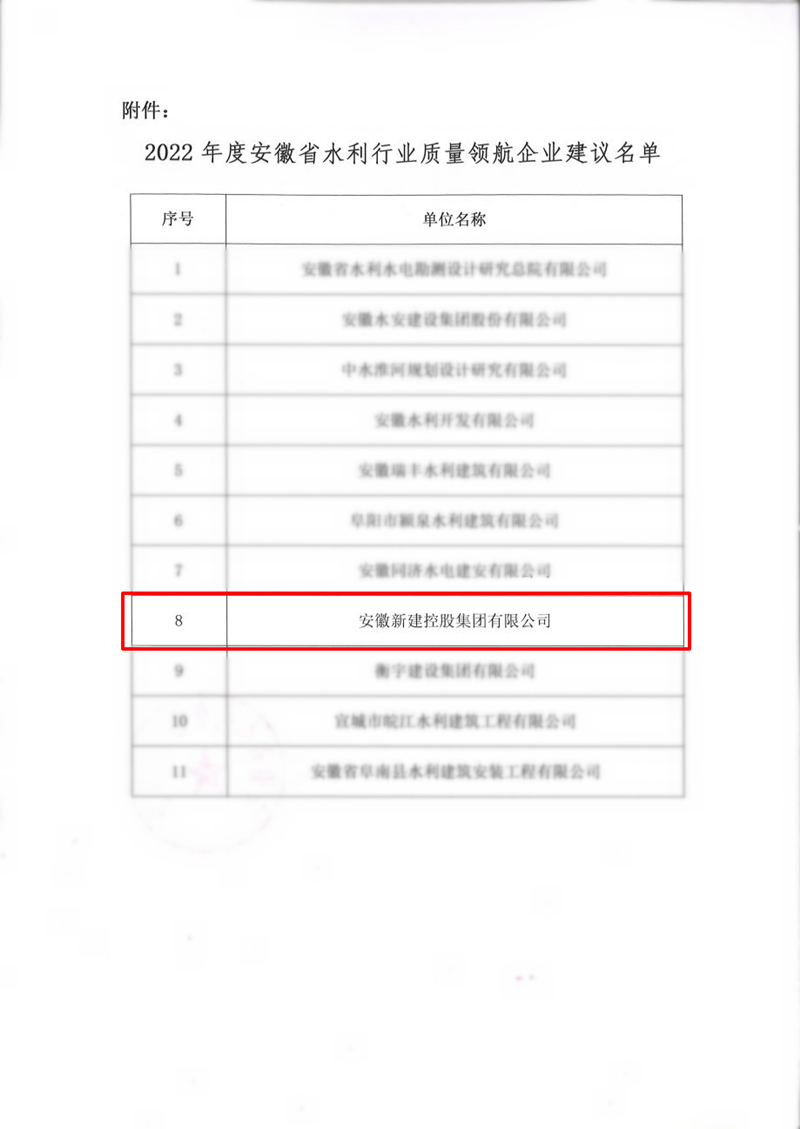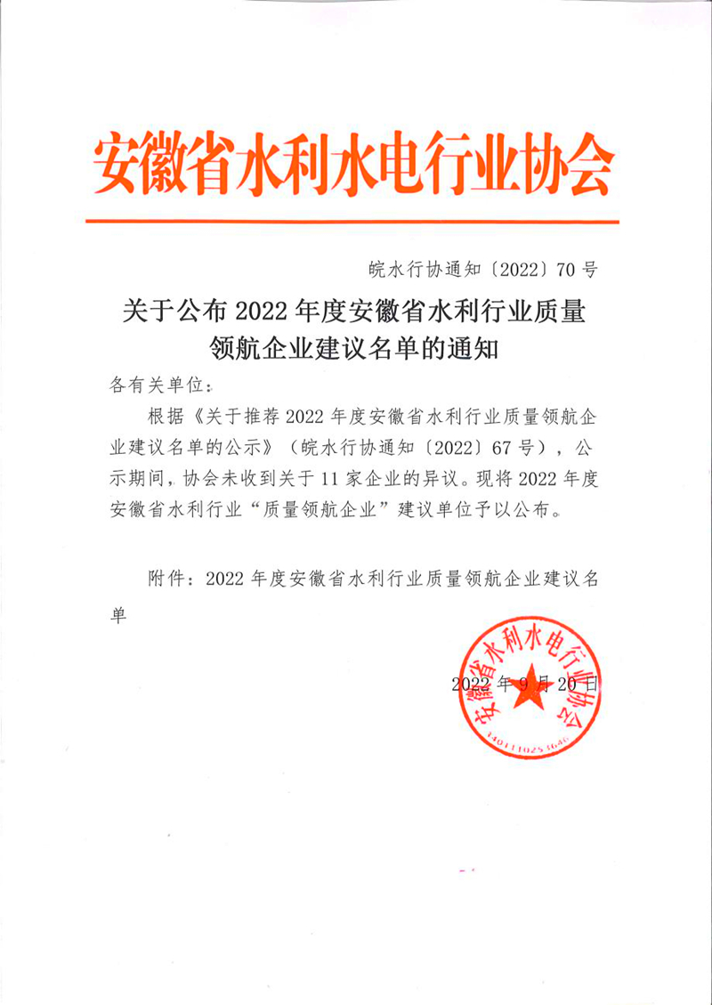 9月20日,安徽省水利水電行業(yè)協(xié)會發(fā)布《關(guān)于公布2022年度安徽省水利行業(yè)質(zhì)量領(lǐng)航企業(yè)建議名單的通知》,集團(tuán)公司獲評“安徽省水利行業(yè)質(zhì)量領(lǐng)航企業(yè)”,體現(xiàn)了行業(yè)協(xié)會對公司影響力、知名度和美譽(yù)度的進(jìn)一步認(rèn)可,也是企業(yè)綜合競爭力的集中表現(xiàn)。