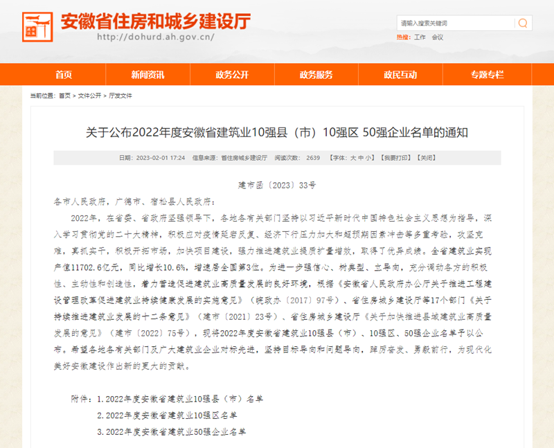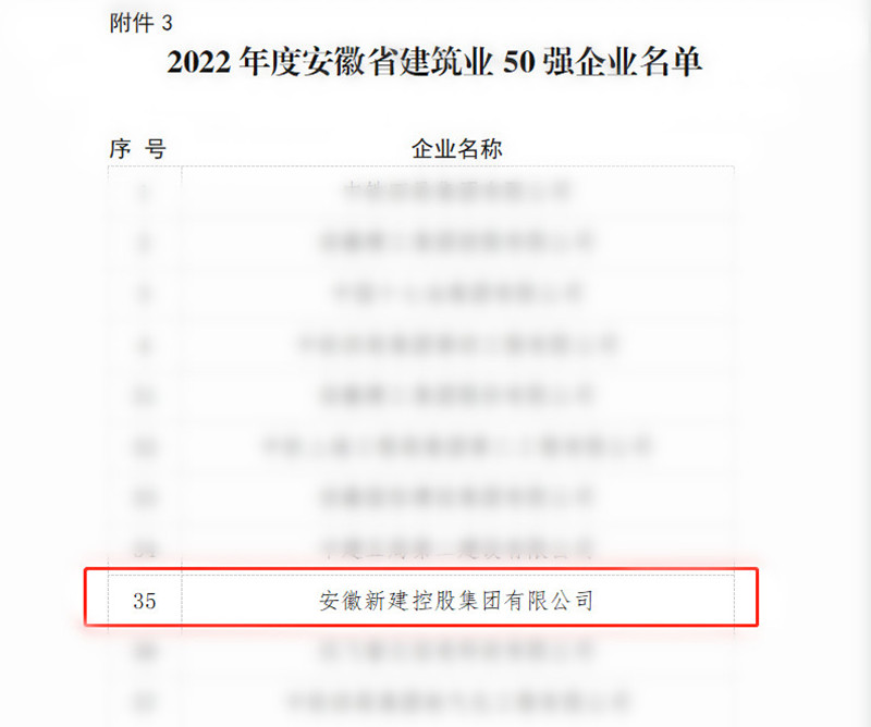 近日,安徽省住建廳公布了2022年度安徽省建筑業(yè)50強企業(yè)名單,安徽新建控股集團憑借深厚的綜合實力再次榮登安徽省建筑業(yè)50強榜單,排序第35位。