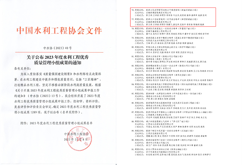 近日,中國水利工程協(xié)會在福州舉行2023年度水利工程優(yōu)秀質(zhì)量管理小組活動成果發(fā)布會,經(jīng)過激烈角逐,集團公司新益求新QC小組《提高大孔徑頂管頂進的水平精度控制》和革舊鼎新QC小組《提高大口徑碎管道的一次吊裝合格率》2項課題成果入圍,喜獲Ⅲ類成果獎。