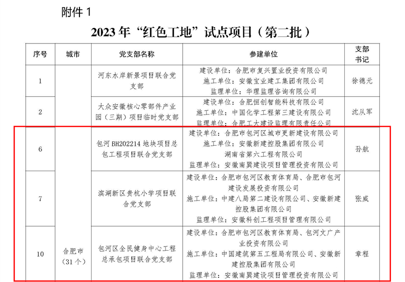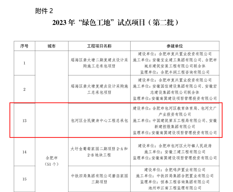 近日,安徽省住房和城鄉(xiāng)建設(shè)廳網(wǎng)站公布了2023年“四個(gè)工地”(第二批)試點(diǎn)項(xiàng)目的名單,集團(tuán)公司承建項(xiàng)目濱湖新區(qū)貴杭小學(xué)、包河區(qū)全民健身中心工程總承包、包河BH202214地塊項(xiàng)目總包工程獲得“紅色工地”試點(diǎn)稱號(hào),其中包河區(qū)全民健身中心工程總承包同時(shí)獲評(píng)“綠色工地”稱號(hào)。