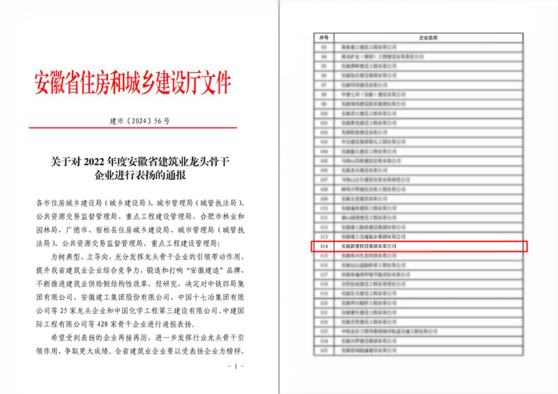 近日,在安徽省住房城鄉(xiāng)建設(shè)廳召開的全省建筑業(yè)發(fā)展工作推進(jìn)會(huì)上,安徽新建控股集團(tuán)有限公司被安徽省住房和城鄉(xiāng)建設(shè)廳、安徽省交通運(yùn)輸廳、安徽省水利廳、安徽省通信管理局聯(lián)合表彰為“2022年度安徽省建筑業(yè)骨干企業(yè)”,并再次榮獲“安徽省優(yōu)秀建筑業(yè)企業(yè)”稱號(hào)!