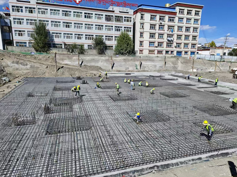 10月12日,在日喀則市藏醫(yī)院中醫(yī)特色重點醫(yī)院建設(shè)施工現(xiàn)場,機(jī)器轟鳴聲不絕于耳,施工車輛來回穿梭,工人們緊張而有序地忙碌著。目前筏板基礎(chǔ)綁扎鋼筋施工整體完成95%,即將進(jìn)行基礎(chǔ)混凝土澆筑施工。