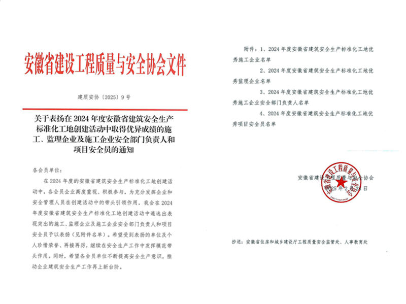 近日,安徽省建設工程質量與安全協(xié)會發(fā)布表揚通知,集團公司榮獲“安徽省建筑安全生產(chǎn)標準化工地優(yōu)秀施工企業(yè)”稱號,公司多名安全管理人員獲得表彰。