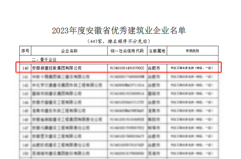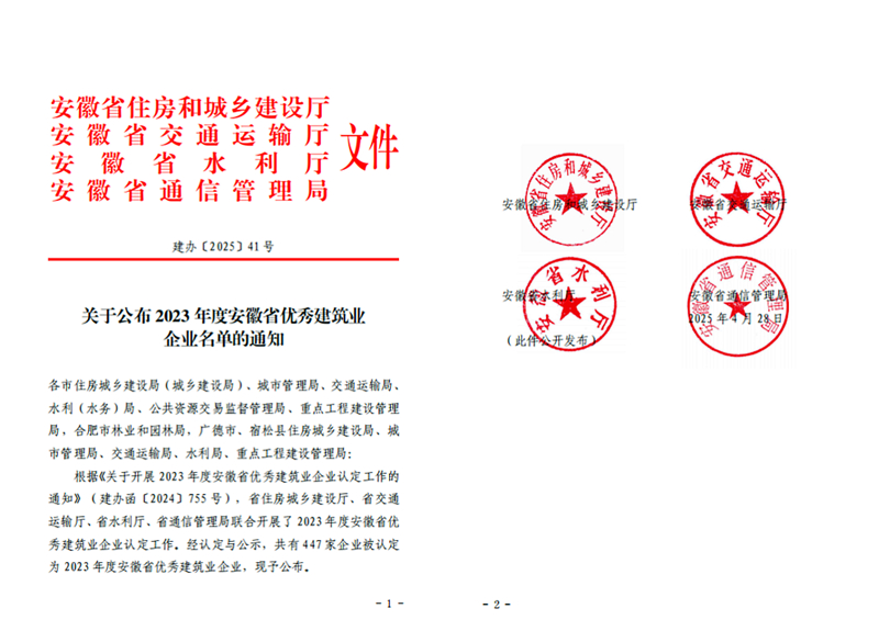 近日,安徽省住房和城鄉(xiāng)建設(shè)廳、省交通運(yùn)輸廳、省水利廳、省通信管理局聯(lián)合公布"2023年度安徽省優(yōu)秀建筑業(yè)企業(yè)"名單。集團(tuán)公司憑借非凡實(shí)力,被認(rèn)定為“安徽省建筑業(yè)骨干企業(yè)”,并連續(xù)四年榮獲“安徽省優(yōu)秀建筑業(yè)企業(yè)”稱號!
