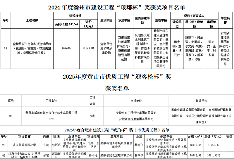 近日,集團(tuán)公司承建的多個項目榮獲合肥市建筑工程“琥珀杯”獎(市優(yōu)質(zhì)工程)、滁州市建設(shè)工程“瑯琊杯”獎、黃山市優(yōu)質(zhì)工程“迎客松杯”獎等多項獎項。