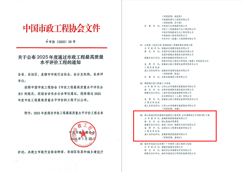 近日,中國市政工程協(xié)會發(fā)布《關于2025年度通過市政工程最高質量水平評價工程的通知》,由集團公司建設的碭山縣城市防洪排澇設施建設工程項目-生態(tài)調蓄綜合子項目EPC工程成功榮獲“2025年度市政工程最高質量水平評價工程”這一市政工程行業(yè)最高榮譽。