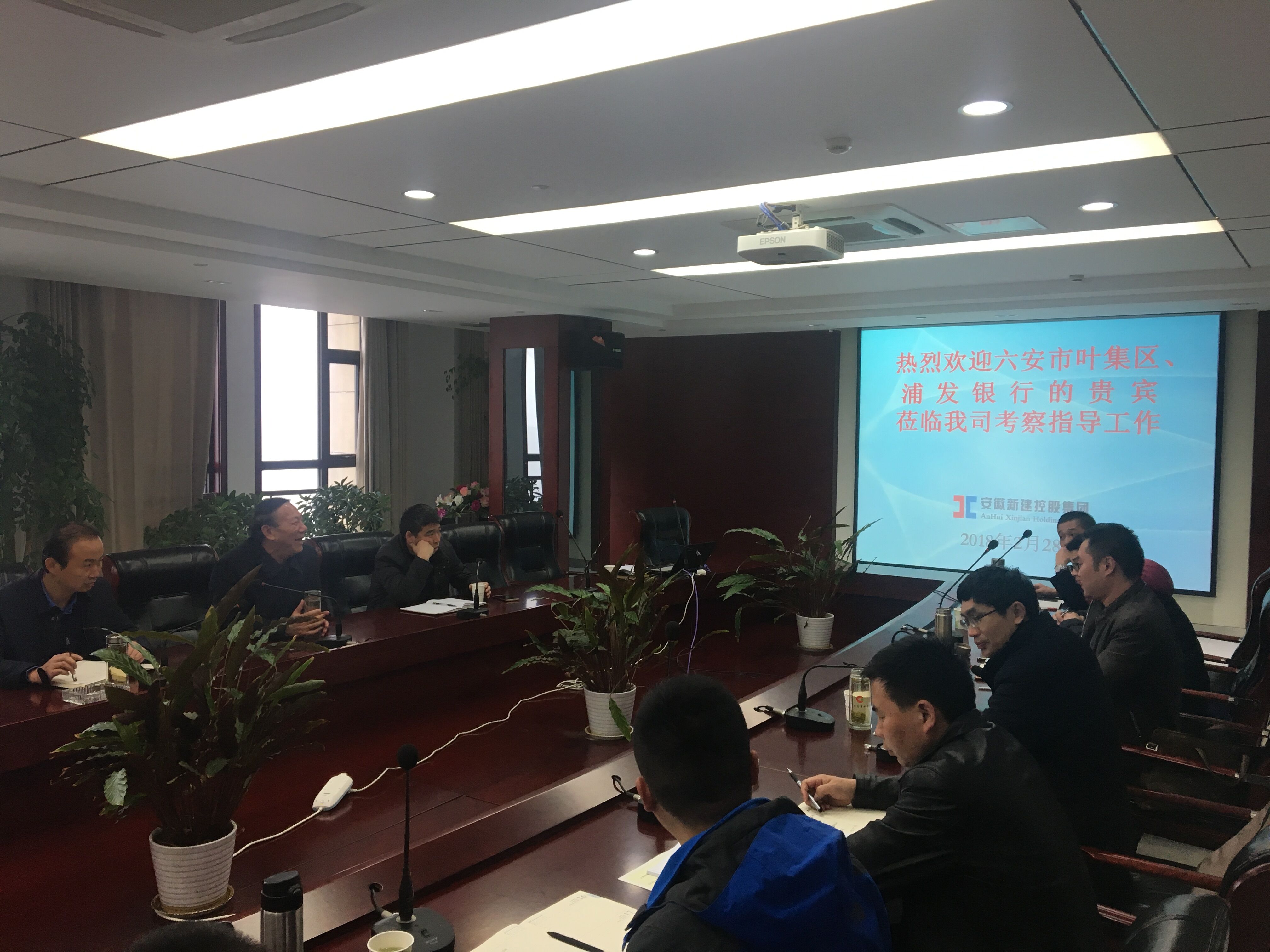 2018年8月28日上午,六安市葉集區(qū)財政局副局長、浦發(fā)銀行蕪湖分行熊赟副行長、六安市葉集建設投資經(jīng)營有限責任公司王磊董事長等一行來我公司洽談工程項目融資事宜,安徽新建控股集團有限公司王杰英董事長及相關領導熱情接待。