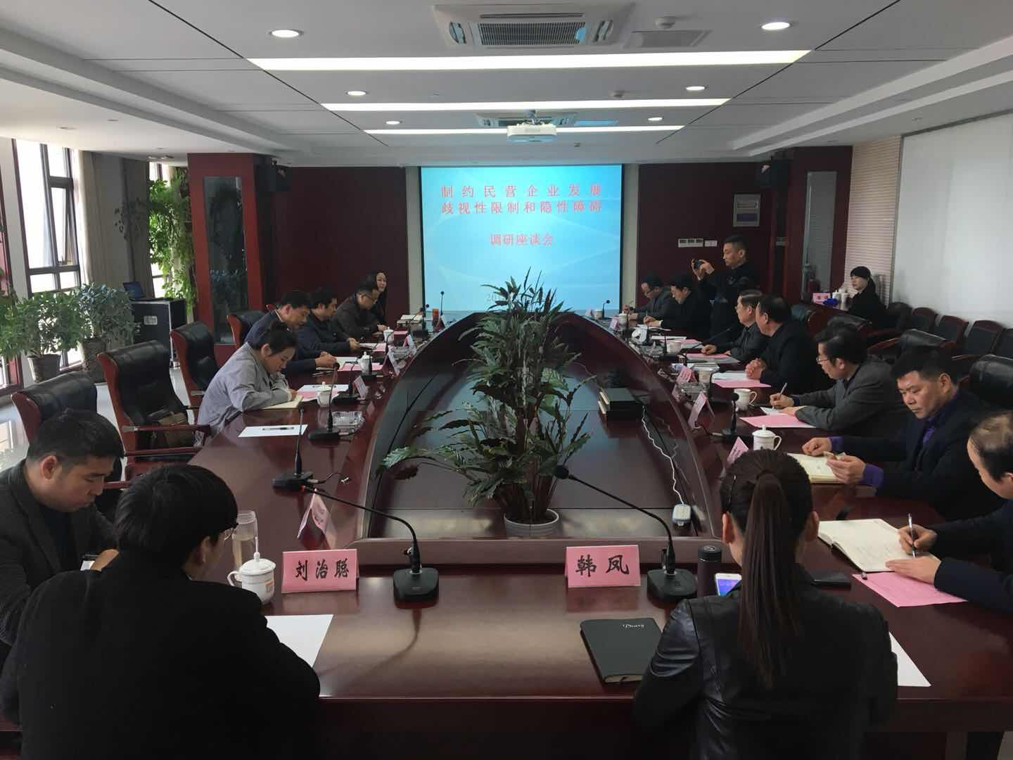 2018年3月13日下午,安徽省工商聯(lián)在我公司舉辦“制約民營企業(yè)發(fā)展歧視性限制和隱性障礙調(diào)研座談會”。出席會議的有安徽省政協(xié)副秘書長、安徽省工商聯(lián)黨組成員、副主席施廣勇、安徽省工商聯(lián)政策研究室主任李增流、安徽省工商聯(lián)機(jī)關(guān)黨委副主任科員袁志慧、安徽省城市基礎(chǔ)設(shè)施投資商會的監(jiān)事會主席、執(zhí)行會長、副會長、秘書長等各位企業(yè)家代表。