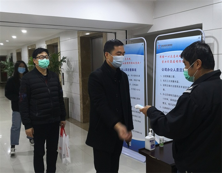 全員復(fù)工第一天,集團(tuán)總部疫情防控領(lǐng)導(dǎo)小組的成員已經(jīng)早早來到集團(tuán)公司,在辦公樓大門處設(shè)立體溫檢測(cè)崗,對(duì)戴口罩返崗的每一位員工認(rèn)真檢測(cè)體溫并做好記錄,體溫合格的員工還要對(duì)手部進(jìn)行消毒才能進(jìn)到辦公區(qū)域。