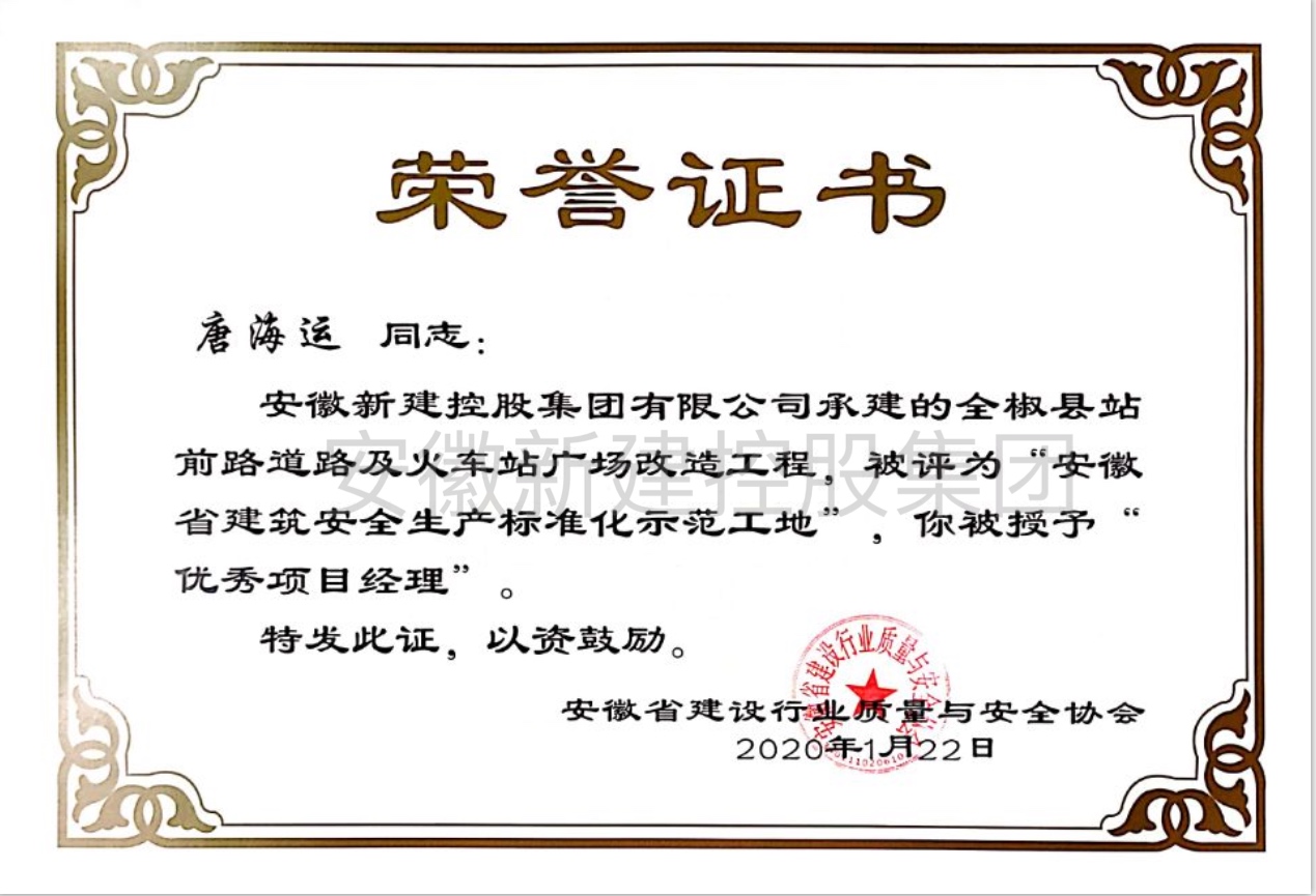 近日,我公司承建的全椒縣站前路道路及火車站廣場改造工程,通過安徽省建設(shè)行業(yè)質(zhì)量與安全協(xié)會(huì)的嚴(yán)格考評,被評為“安徽省建筑安全生產(chǎn)標(biāo)準(zhǔn)化示范工地”稱號(hào)。唐海運(yùn)獲“優(yōu)秀項(xiàng)目經(jīng)理”稱號(hào)。
